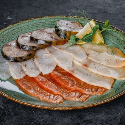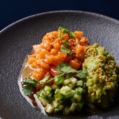 Тар-тар из лосося с кремом авокадо и кунжутными огурцами