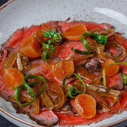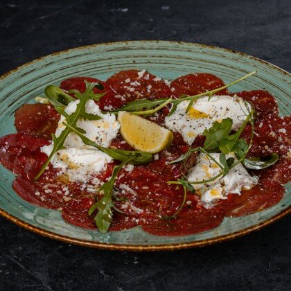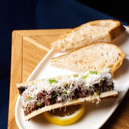 Тар-тар из говядины на мозговой косточке с чиабаттой