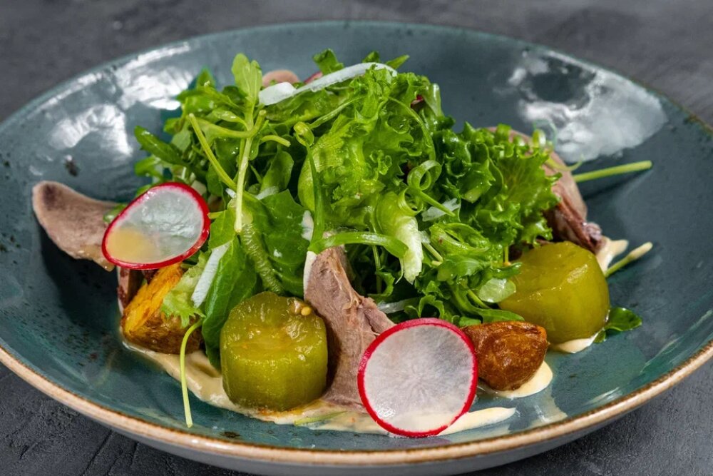 Салат с говяжьим языком и горчичным соусом