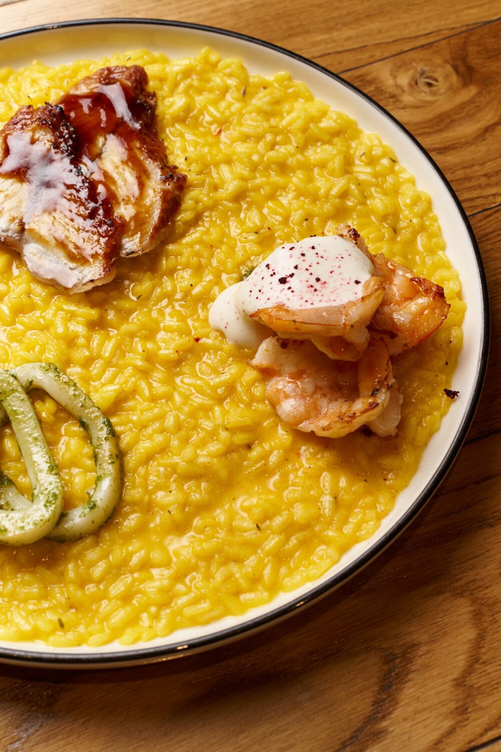 Ризотто с шафраном, кальмаром с песто, креветкой, пармезаном и угрем унаги