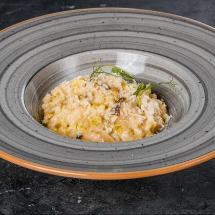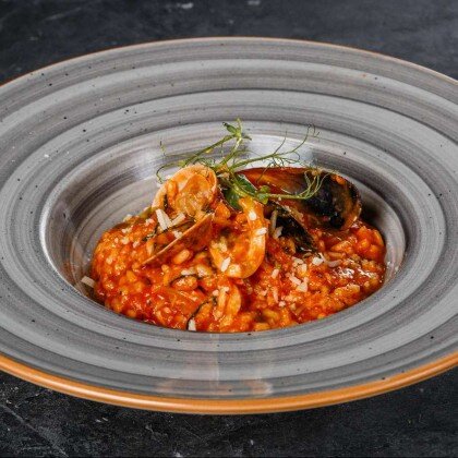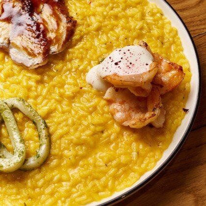Ризотто с шафраном, кальмаром с песто, креветкой, пармезаном и угрем унаги