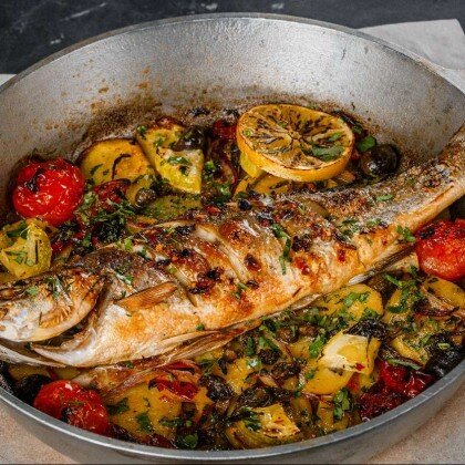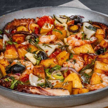 Дары моря, запеченные в печи с молодым картофелем и вялеными томатами