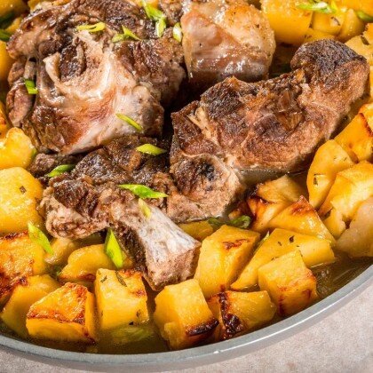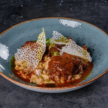 Телячьи щеки, томленые в вине с жемчужной крупой