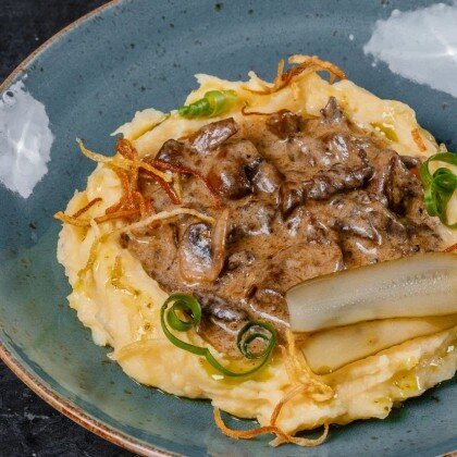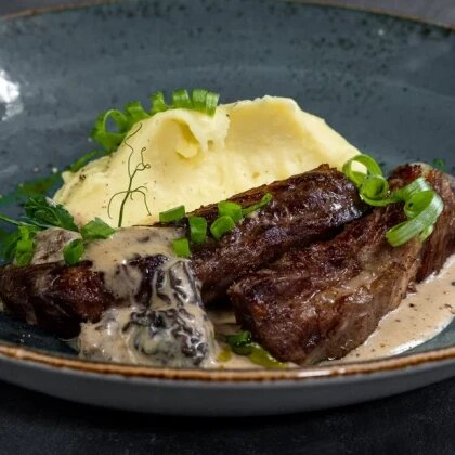 Межреберная говядина с картофельным пюре и соусом из сморчков