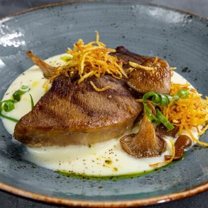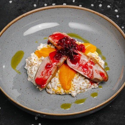 Грудка утки с полбой, кремом из моркови и брусничным соусом