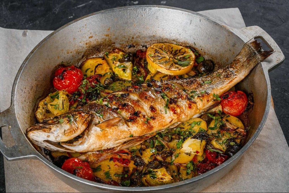 Сибас, запеченный в печи с картофелем