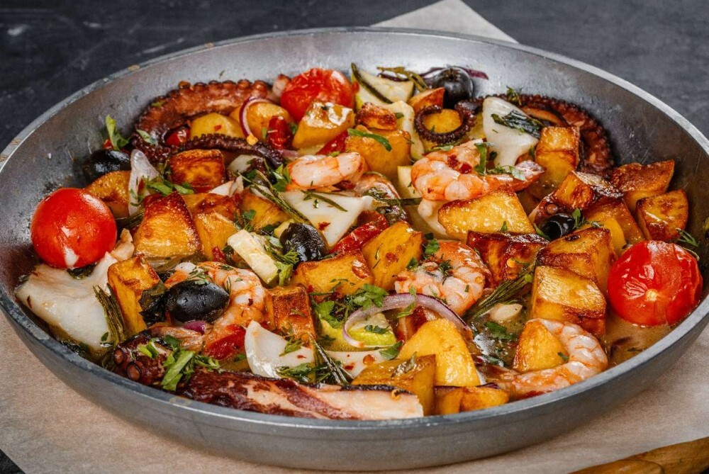 Дары моря, запеченные в печи с молодым картофелем и вялеными томатами