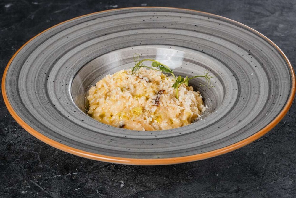 Ризотто с шафраном, кальмаром с песто, креветкой, пармезаном и угрем унаги