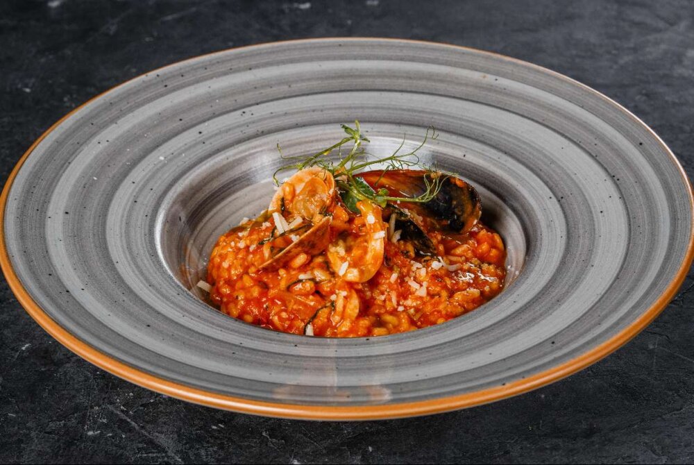 Ризотто с шафраном, кальмаром с песто, креветкой, пармезаном и угрем унаги